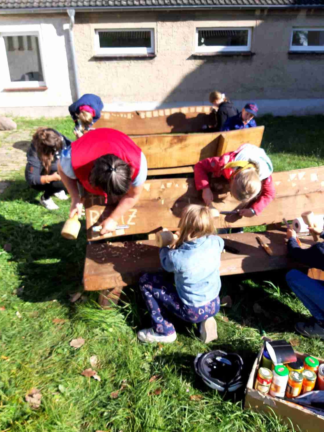 Die Kinder waren von Anfang an sehr motiviert und konnten so ihre Kreativität ausleben. Unterstützt wurden sie von den Graffiti-Künstlern Lele Peters und Ute Paulmann-Boll. Als Betreuer waren Johanna Knie, Michael Bolz, Matthias Labes und Felix Opitz dabei. Aber es war nicht das einzige Objekt, welches die Kinder gestalteten. Der Dorfverein Pro Reetz e.V. hatte noch einmal drei Sitzbänke angeschafft. Die sollten, wie auch die vorherigen, bunt bemalt werden. Dafür hatte sich Ute Paulmann-Boll etwas Besonderes einfallen lassen. Mit einfachem Schnitzwerkzeug wurden zuerst verschiedene Formen in die Bänke geschnitzt und danach farblich untermalt. Die Farben dafür wurden von Dario Scheibel gesponsert.