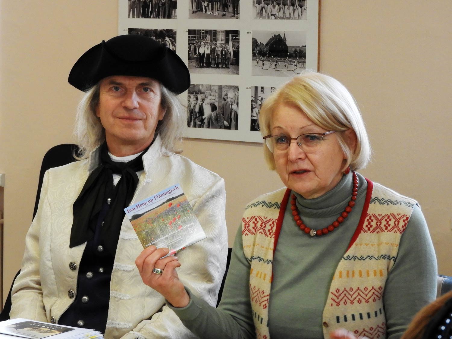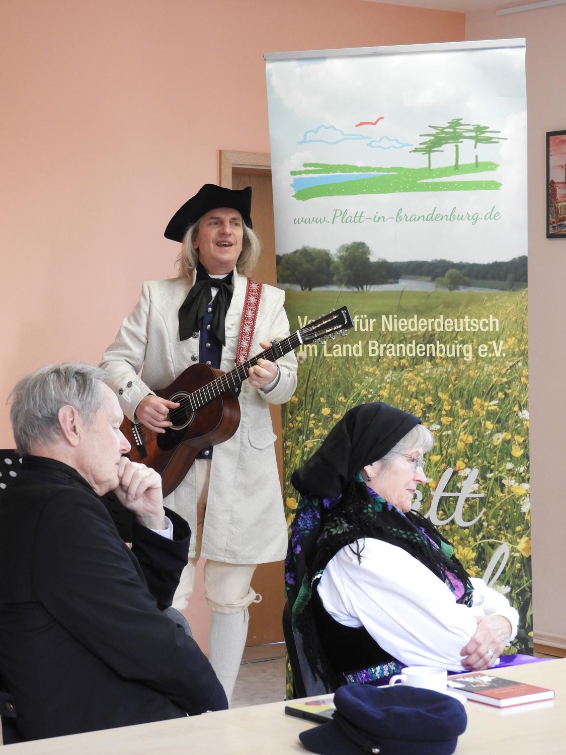 An seiner Seite sind Astrid Flügge vom Verein für Niederdeutsch im Land Brandenburg e.V., die Fredersdorfer Mundartexpertin und „Muttersprachlerin“ Maria Sternberg und Mitglieder des Heimatvereins der Flämingfreunde, die in ihren Trachten für den passenden Rahmen zur Musik sorgen.