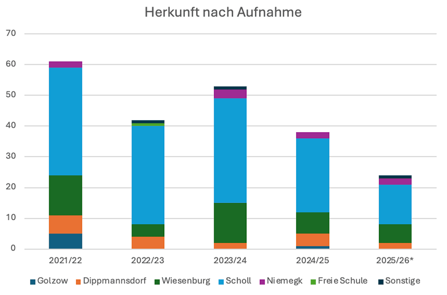 Ein weiterer Aspekt, der unverzügliches Handeln erfordert, ist der Rückgang der Anmeldungen von Grundschülern aller umliegenden Schulen für den Wechsel an unsere Oberschule. Für das Schuljahr 2025/2026 haben lediglich 13 von 70 Sechstklässler der Grundschule „Geschwister Scholl“ die Oberschule als Erstwunsch angegeben. Aus den Grundschulen Golzow, Dippmannsdorf, Wiesenburg, Bad Belzig, Niemegk und der Freien Grundschule resultieren lediglich 24 Erstwünsche für unsere Oberschule. (Abbildung 1)