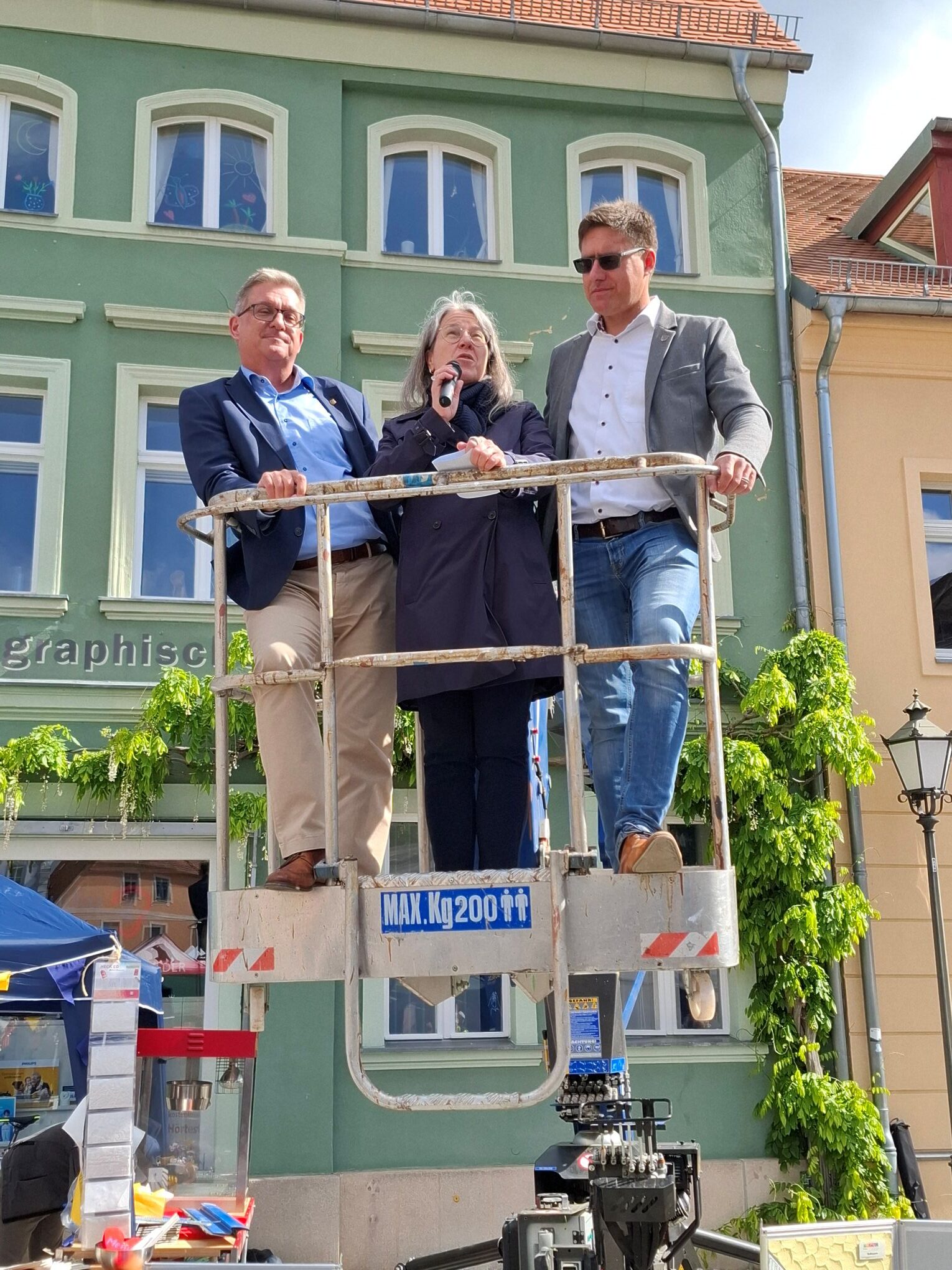 Bereits zum Auftakt der Veranstaltung verliehen hochkarätige Grußworte der Messe einen feierlichen Rahmen. Und das auf besondere Weise: Die Reden von Dr. Robert Pulz, Bürgermeister der Stadt Bad Belzig, Dr. Christoph Löwer, Beigeordneter des Landkreises Potsdam-Mittelmark, und Sandra Stahl, Geschäftsführerin Operativ der Agentur für Arbeit Potsdam, wurden von einem Steiger der Firma Mende GmbH aus luftiger Höhe gehalten – mit eindrucksvollem Blick über das gesamte Messegelände. Diese ungewöhnliche Perspektive war ein echtes Highlight und stand sinnbildlich für den Weitblick, den junge Menschen für ihre Zukunft brauchen.