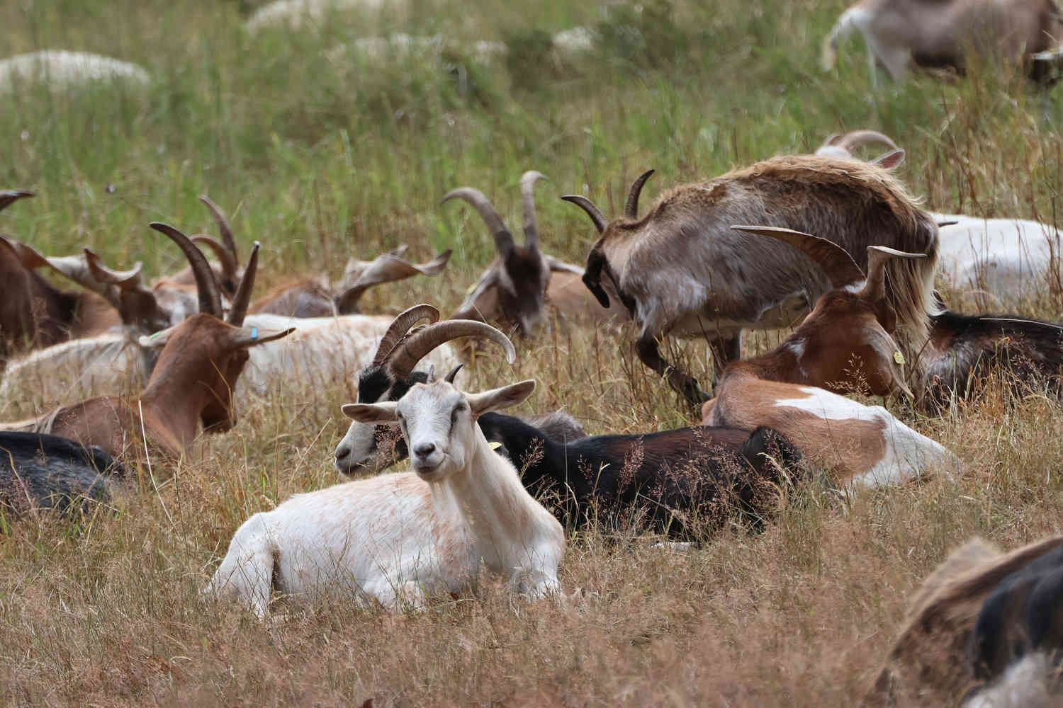 Im Moment stehen am Ende der Sichtachse in Bahnhofsnähe die Ziegen und Schafe von Max Hafemann aus Treuenbrietzen auf einer Fläche von etwa fünf Hektar und sorgen dort für Ordnung. Bewacht werden sie von zwei aufmerksamen Herdenhunden.