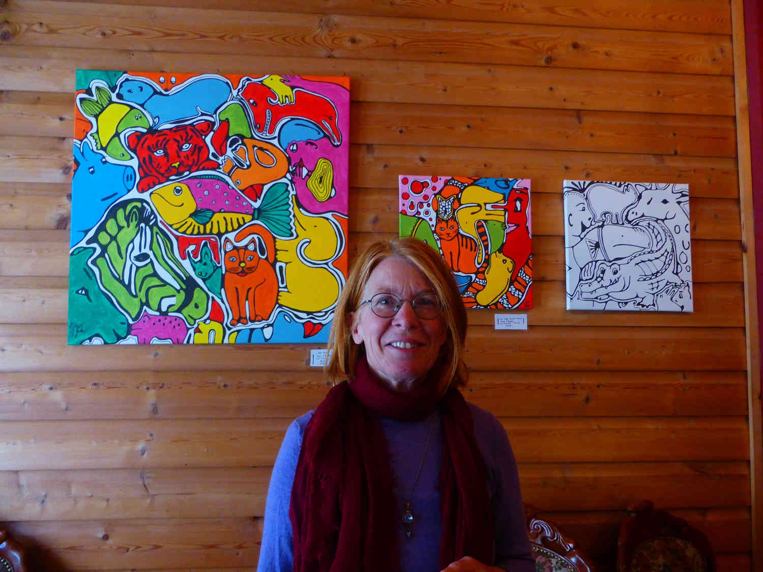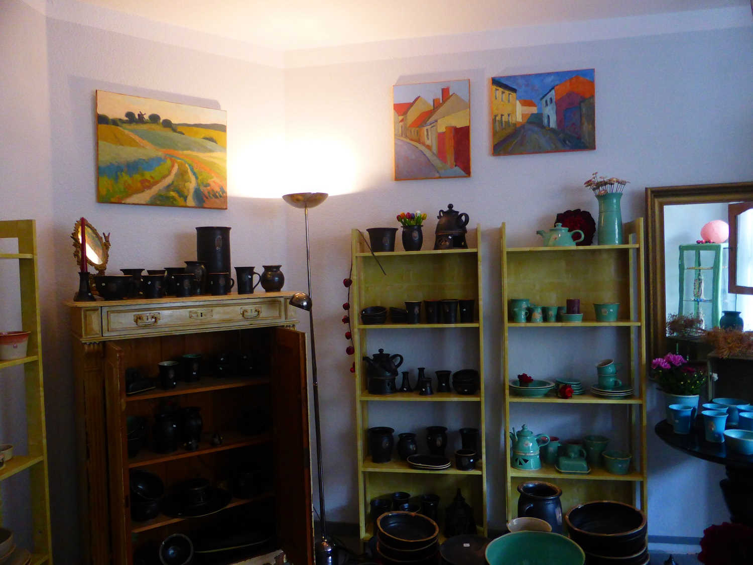 In der Töpferei von Karina Hilbig waren Bilder des Malers Nikolai Kraneis ausgestellt. Der Bad Belziger zeigte viele Natur- und Landschaftsbilder aus der Region und Ansichten der Stadt. Sie fügten sich perfekt in die Umgebung mit der Keramik ein. Karina Hilbig zeigt neben ihrer „normalen“ Gebrauchskeramik ihre neue Serie in himmelblau. Auch in anderen Geschäften stellten Künstler ihre Werke aus. Etwas moderner sind die Bilder von Jaqueline Gustke. So kommt eine Katze mit verschiedener Mimik immer wieder vor. „Die Katze braucht Urlaub“, erklärt sie schmunzeln ein Bild mit traurigem Katzengesicht – „Die Katze war im Urlaub“ mit einer mit einem lächelnden Katzengesicht.