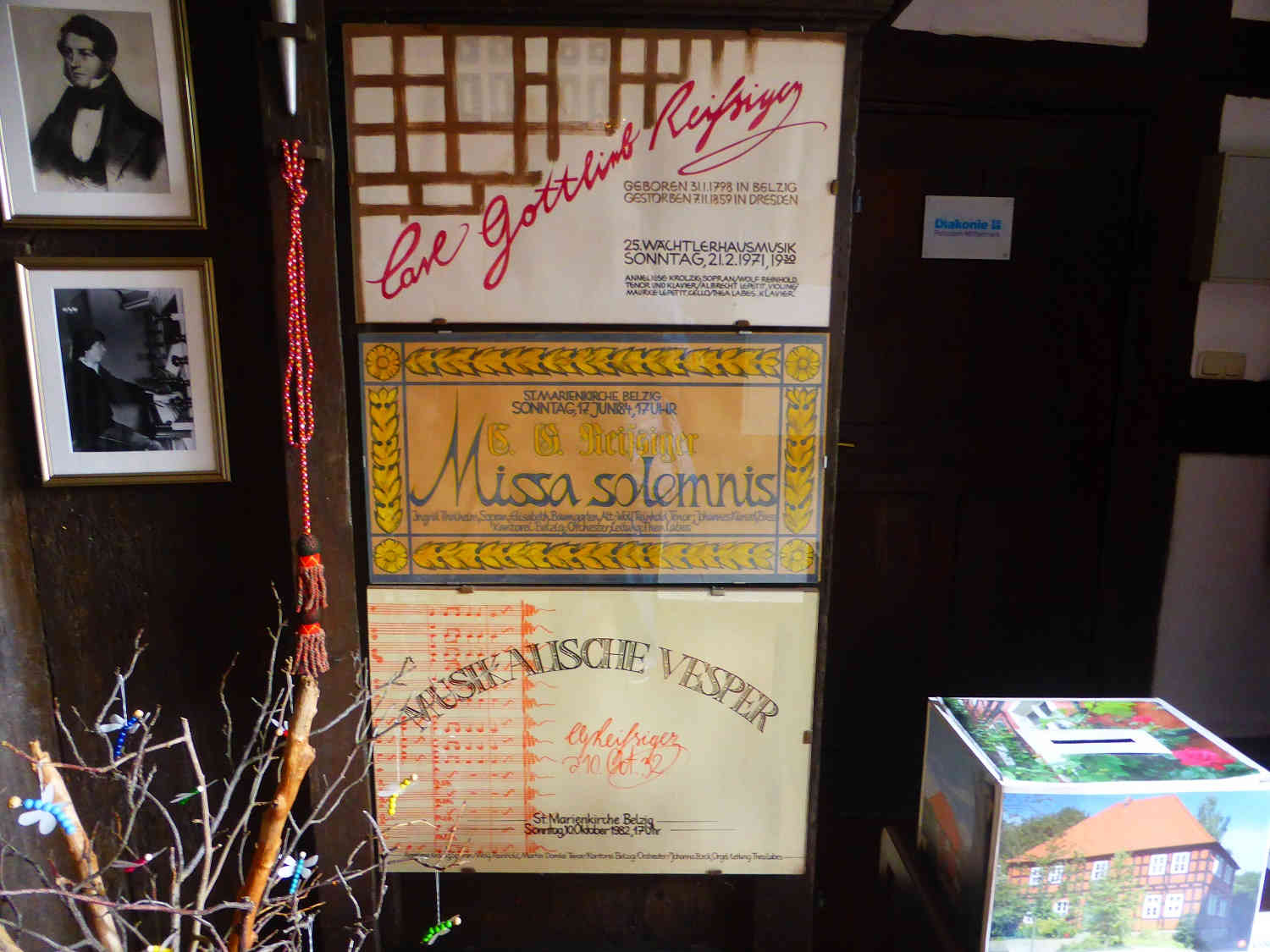 Das Reißiger Haus zeigte Plakate der Kirchenmusikerin Thea Labes. Sie hat sie alle selbst gestaltet und gemalt. Die verschiedenen Motive passen zu den jeweiligen Konzerten. Früher konnte man nicht einfach in einen Copyshop gehen und Plakate vervielfältigen lassen. So hat Thea Labes viele der Plakate mehrmals gemalt, um sie an verschiedenen Orten aufhängen zu können. Und so ist jedes ein Unikat.