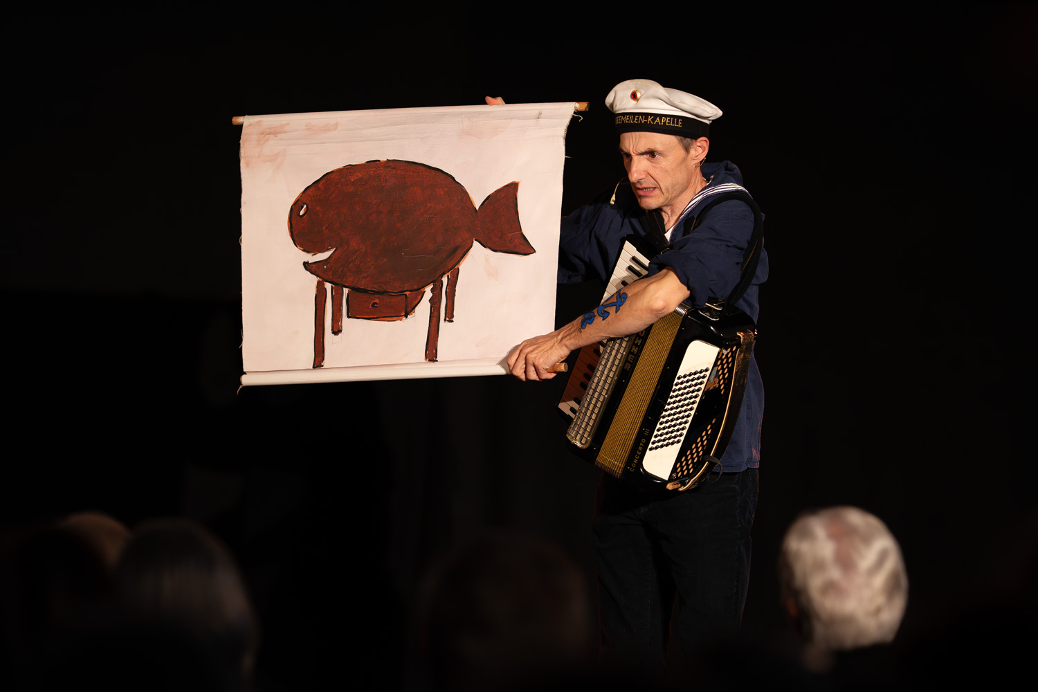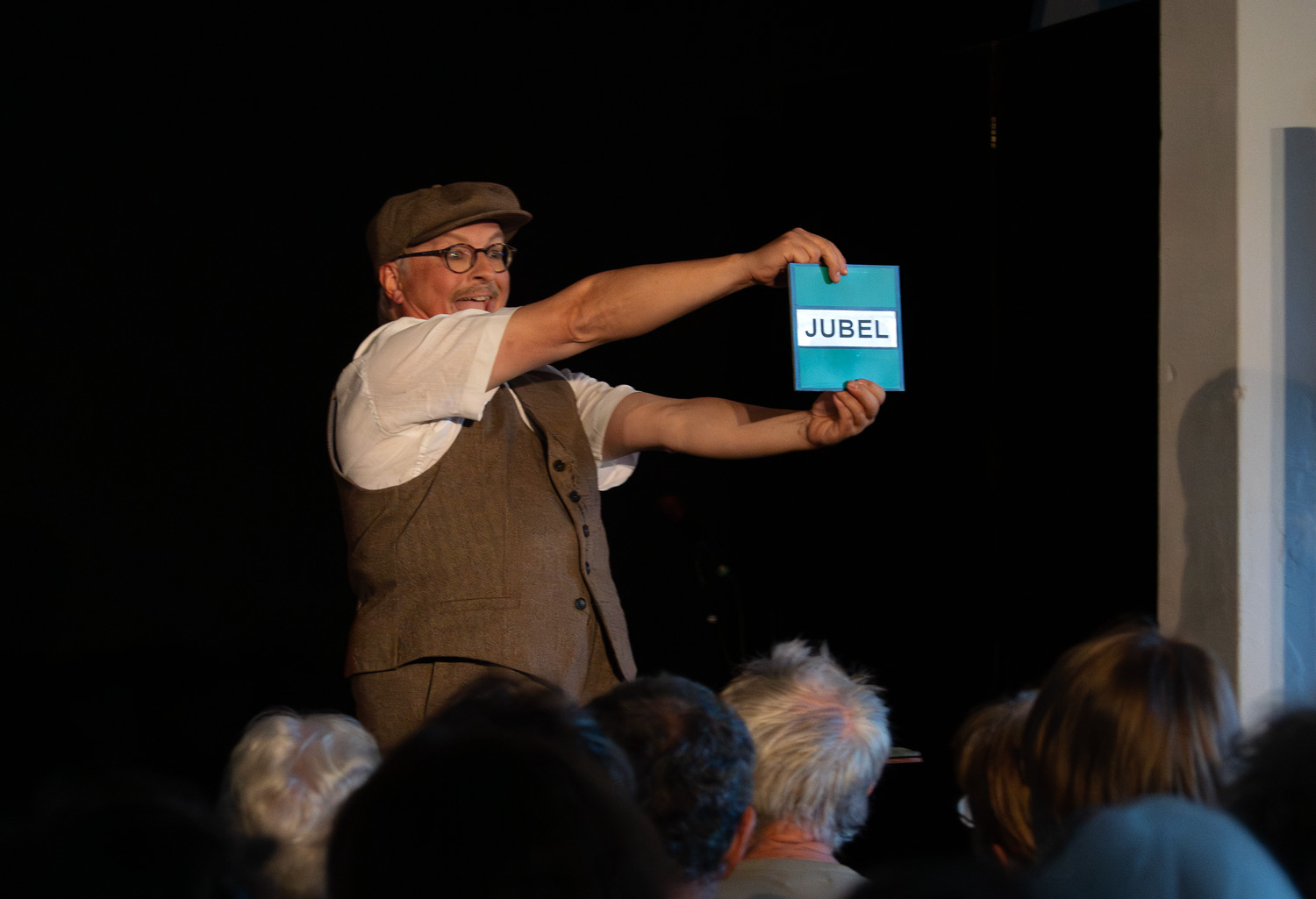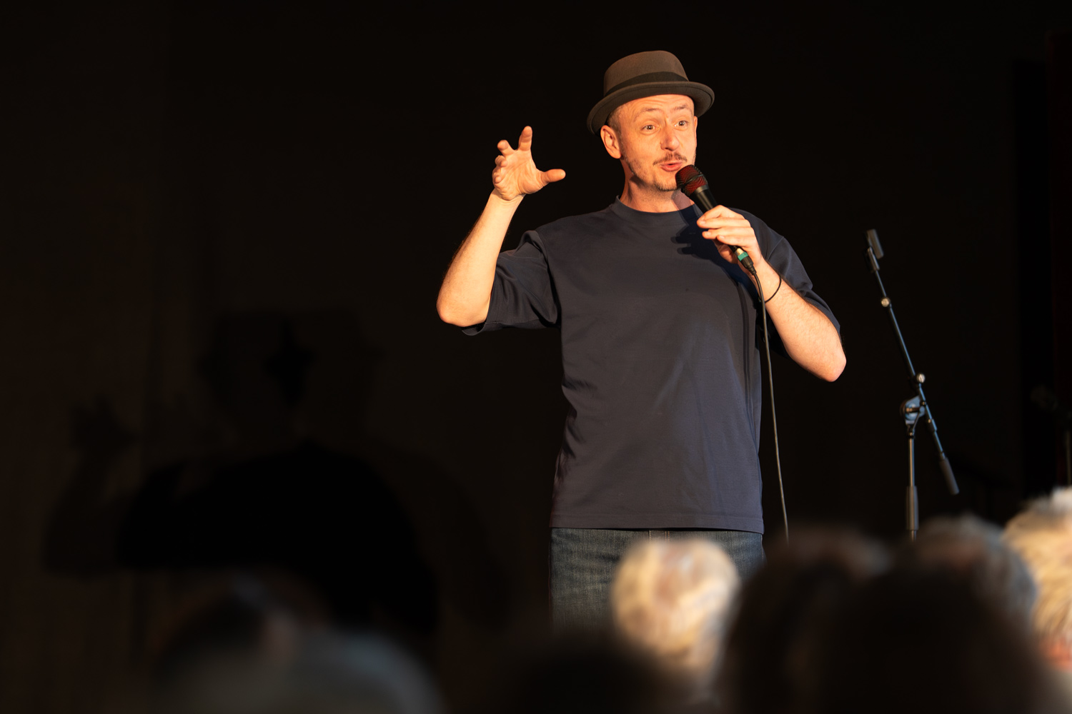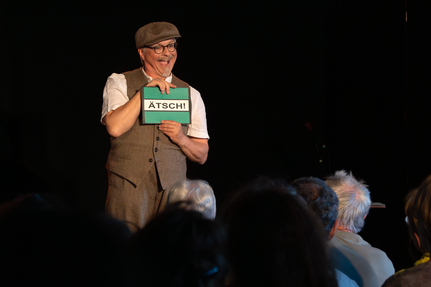 Während der erste Künstler seine Kunst ganz wortlos präsentierte bestand die Kunst von Stefan Danziger ganz aus dem Wort. Mit charmanter Berliner Schnauze plauderte er sich immer mehr in Schwung, so gekonnt nebenher, dass man als Zuhörer vergaß, dass das einstudiert ist. Er erzählte vom Kaufmannsladen seiner Tochter, der voller Waren aus Holz ist, – und bei dem er mitspielen musste. Doch kaum wollte er eine Holzkurke oder Holzbanana kaufen, antwortete sie: „Ham wa nich!“ Woher hat sie diese DDR-Erfahrung her? Sie ist fünf.