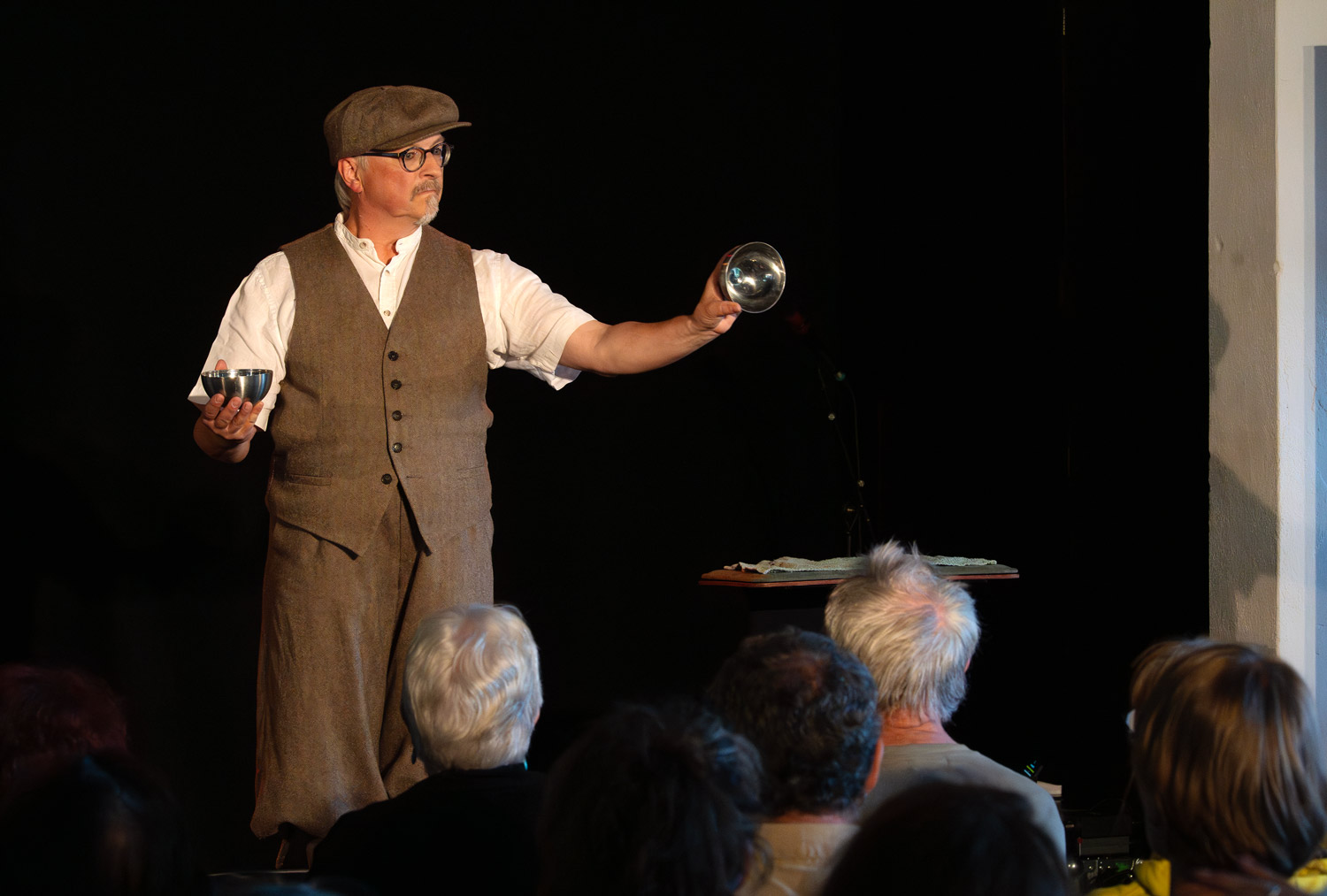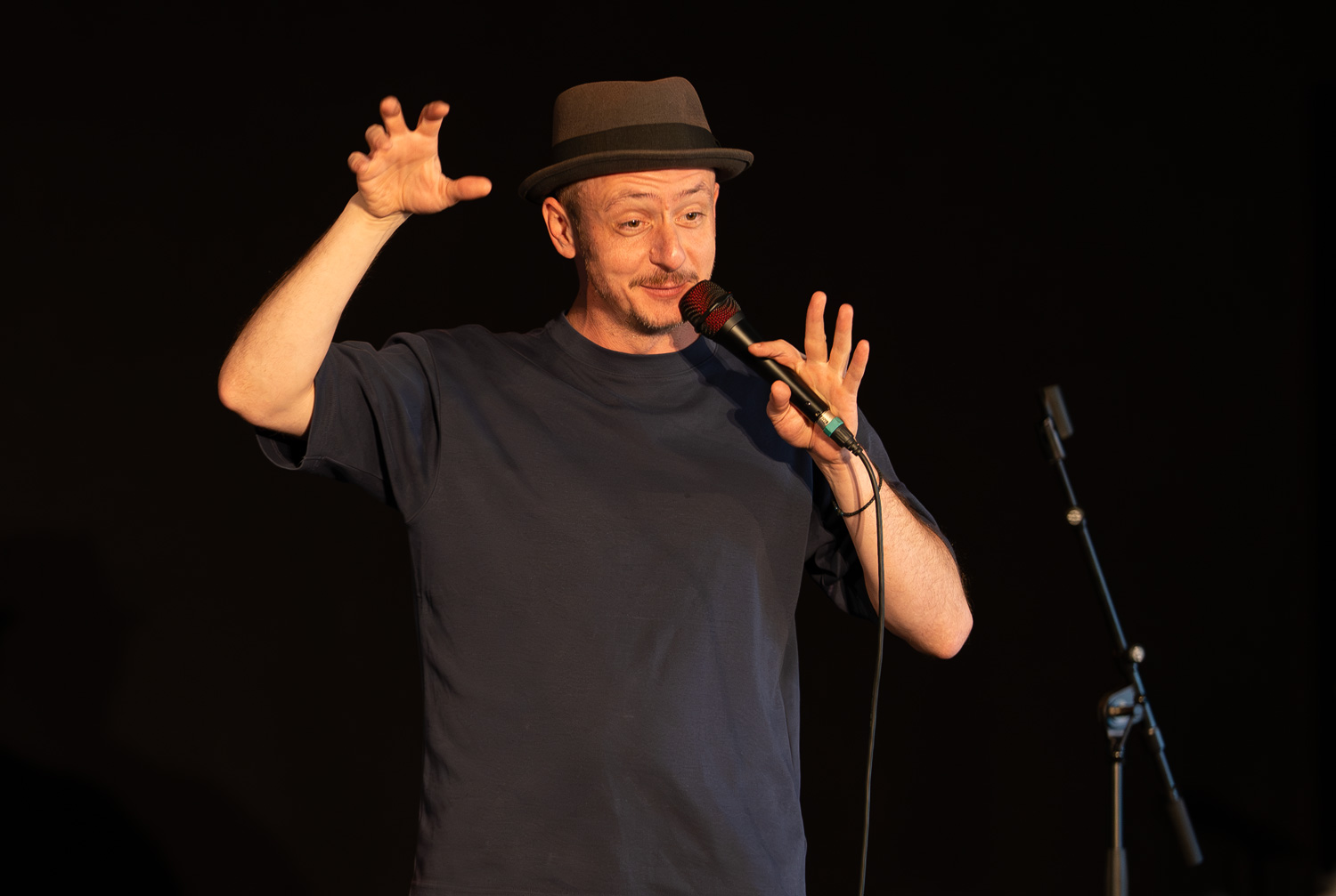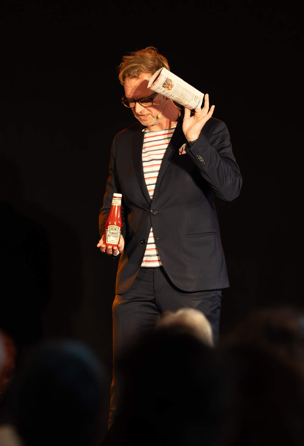 Während der erste Künstler seine Kunst ganz wortlos präsentierte bestand die Kunst von Stefan Danziger ganz aus dem Wort. Mit charmanter Berliner Schnauze plauderte er sich immer mehr in Schwung, so gekonnt nebenher, dass man als Zuhörer vergaß, dass das einstudiert ist. Er erzählte vom Kaufmannsladen seiner Tochter, der voller Waren aus Holz ist, – und bei dem er mitspielen musste. Doch kaum wollte er eine Holzkurke oder Holzbanana kaufen, antwortete sie: „Ham wa nich!“ Woher hat sie diese DDR-Erfahrung her? Sie ist fünf.