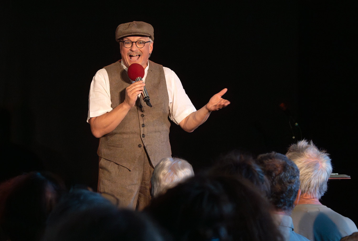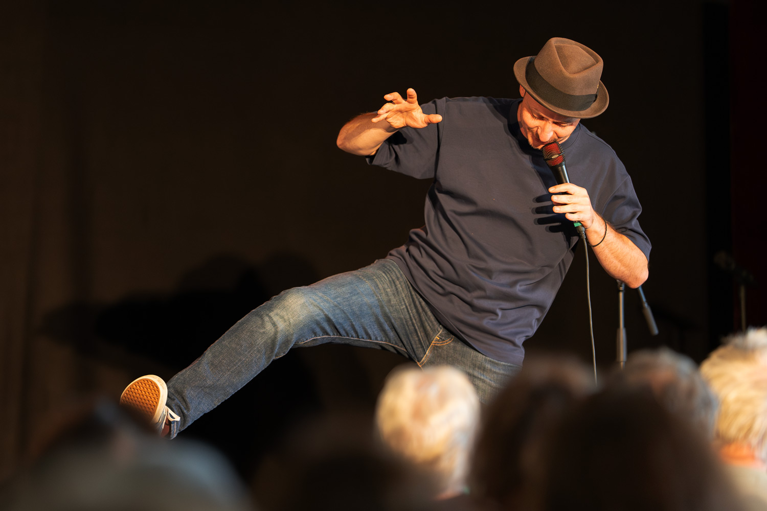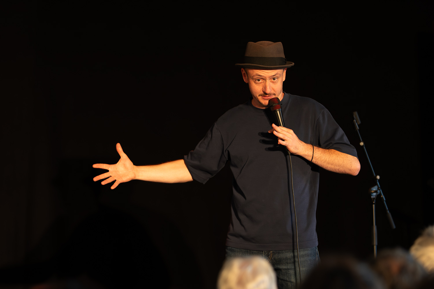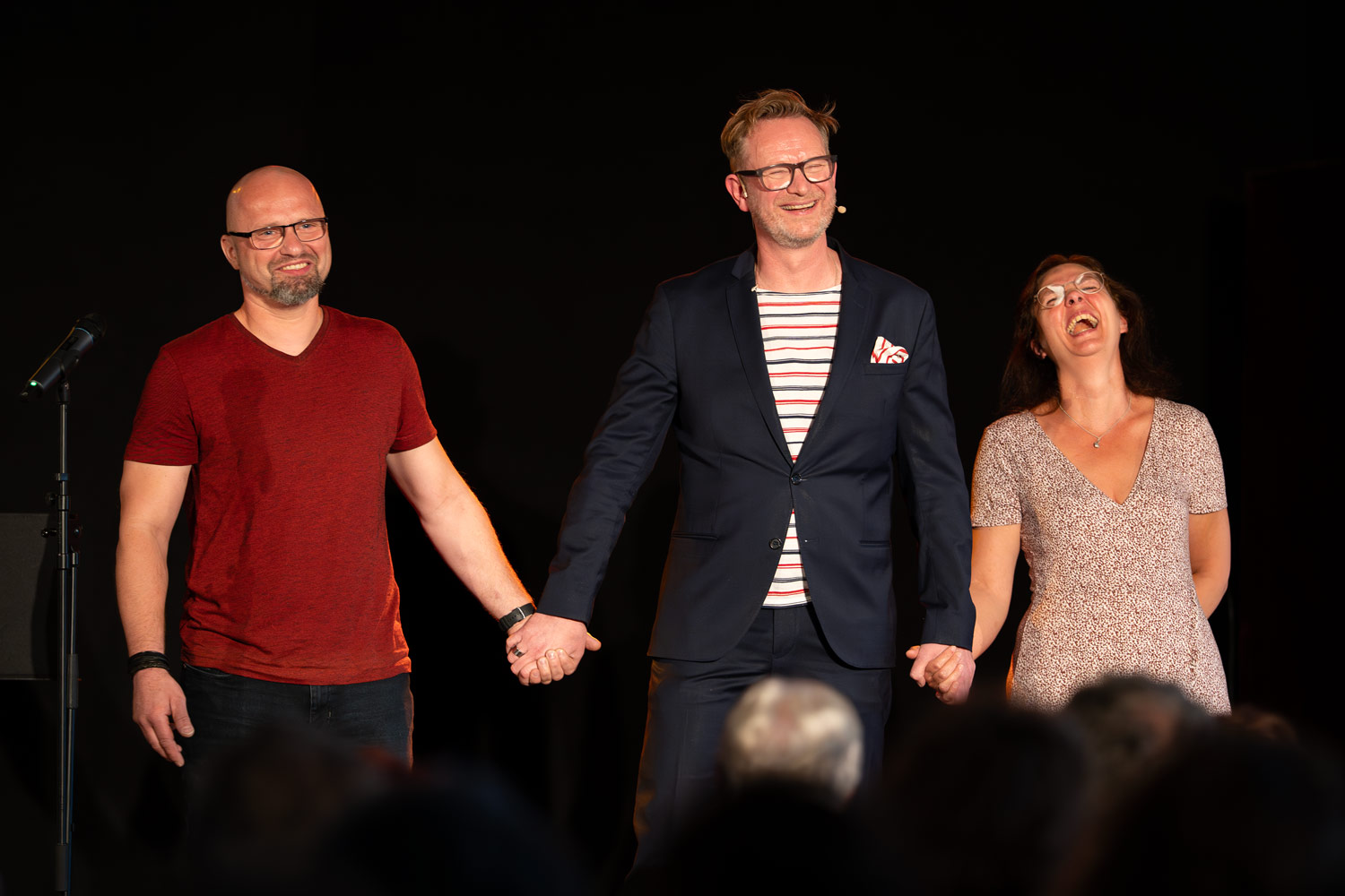 Während der erste Künstler seine Kunst ganz wortlos präsentierte bestand die Kunst von Stefan Danziger ganz aus dem Wort. Mit charmanter Berliner Schnauze plauderte er sich immer mehr in Schwung, so gekonnt nebenher, dass man als Zuhörer vergaß, dass das einstudiert ist. Er erzählte vom Kaufmannsladen seiner Tochter, der voller Waren aus Holz ist, – und bei dem er mitspielen musste. Doch kaum wollte er eine Holzkurke oder Holzbanana kaufen, antwortete sie: „Ham wa nich!“ Woher hat sie diese DDR-Erfahrung her? Sie ist fünf.