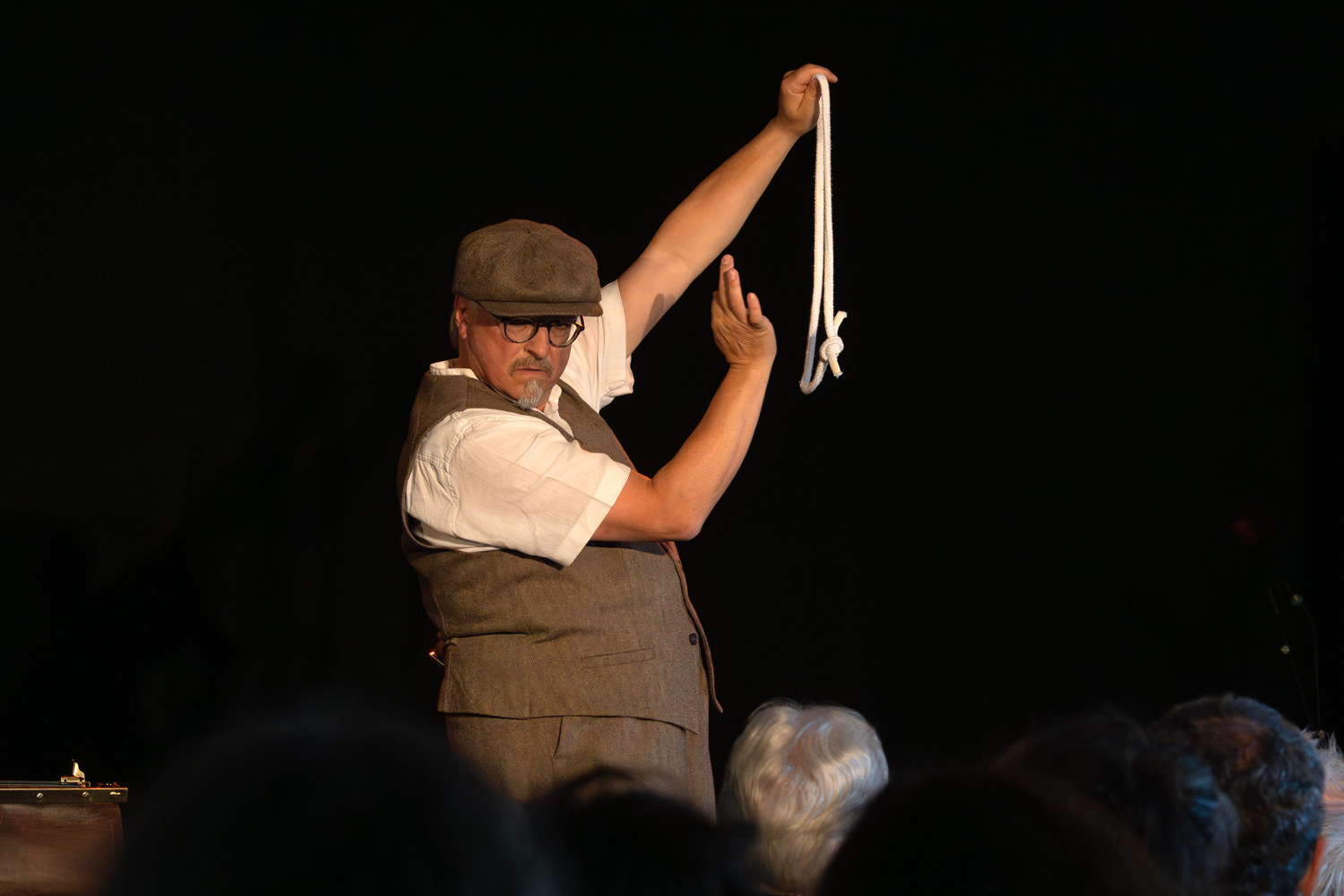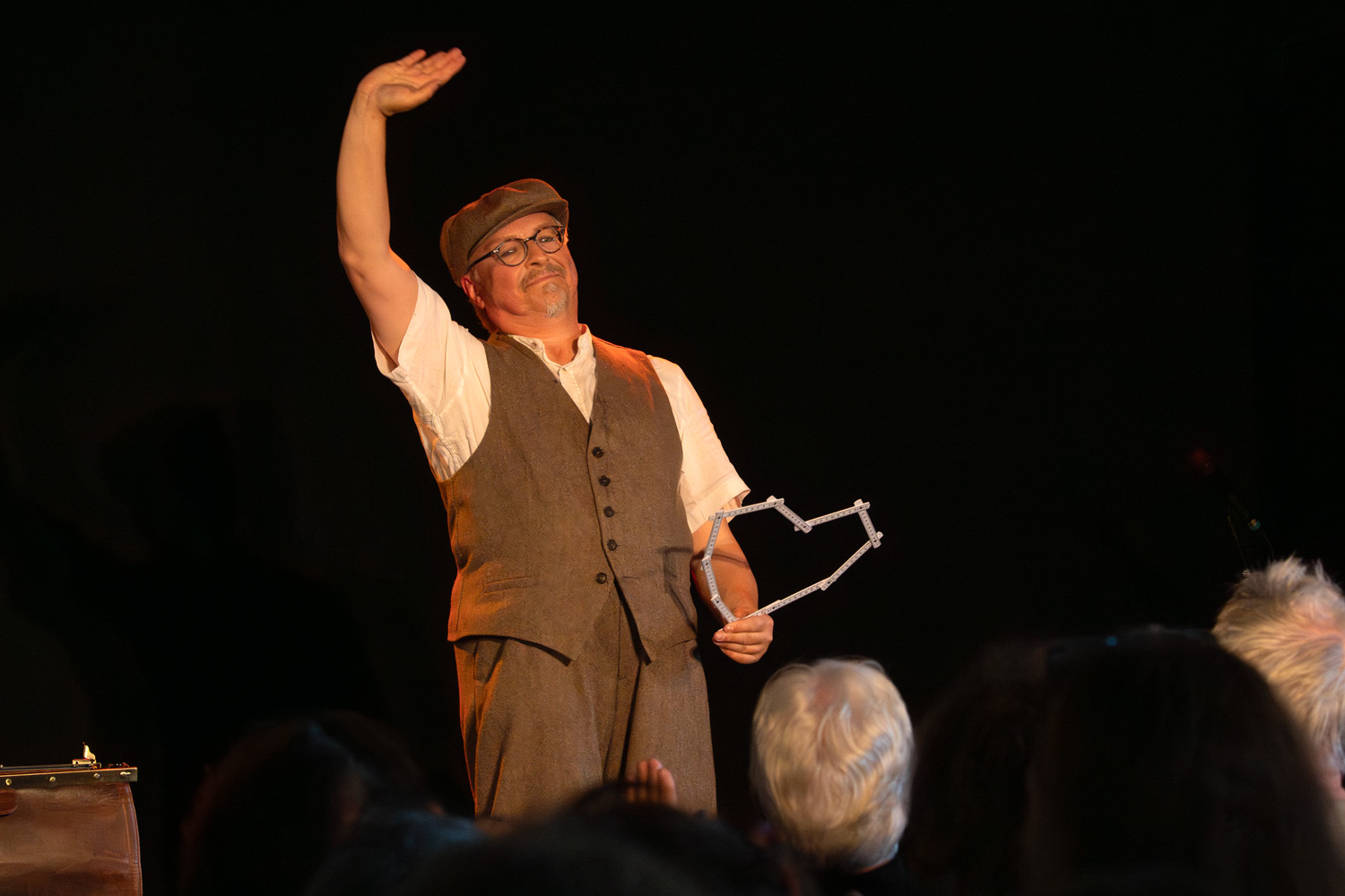 Als erstes zauberte und bezauberte sprachlos Cirque Belu. Im Mittelpunkt standen ganz die gezauberten Überraschungen, die Zauberer Bernhard Luksch gekonnt präsentierte. Selbst die Kommunikation mit dem Publikum bewältigt BeLu, ohne ein Wort zu sagen. Nett verpackt zeigte er neben bekannten Tricks wie dem in der Faust verschwindenen Tuch zahlreiche weitere Kunststücke. Erstaunlich, was ein Zollstock alles sein kann: Ein Regenschirm, ein Segelboot, ein Degen, eine Gitarre, eine Angel, ein Hund und noch so manches mehr. So versteht es BeLu, die Fantasie der Zuschauer anzuregen, und bekam zurecht viel Applaus.