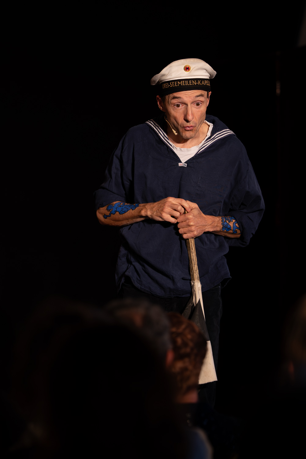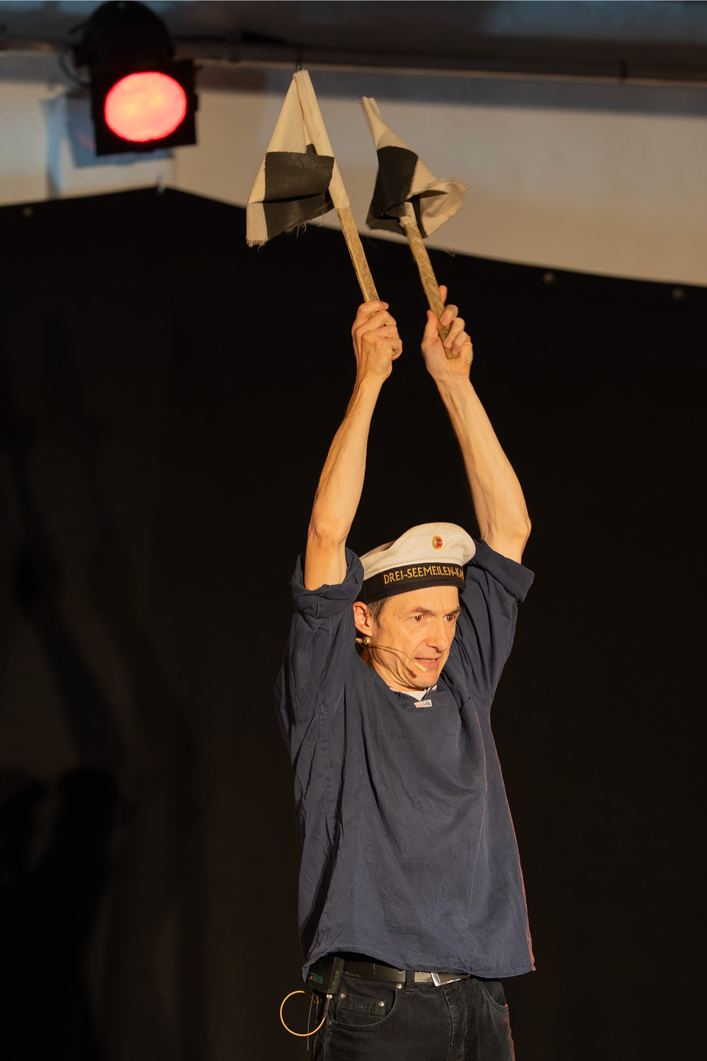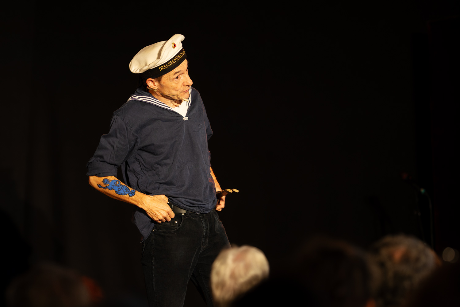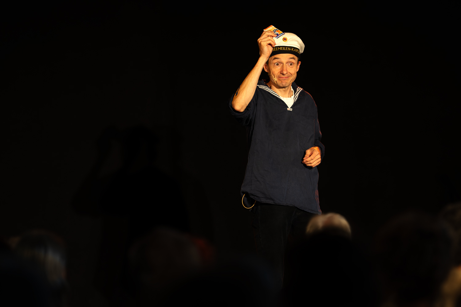 Als letzter trat Nagelritz in das Rennen um die Bachstelze ein. (Wer denkt da nicht an Ringelnatz?) Der Bremer Matrose aus Gelsenkirchen erweist sich als weiterer würdiger Anwärter auf die Bachstelze. „Ein Gelsenkirchner kommt überall zurecht – und findet es überall schön.“ Mit Wortwitz und ausdrucksstarker Mimik unterhielt er sein Publikum. Heute sind alle tätowiert. Im Altersheim treffen sie sich dann zum Bilderraten. Weiter in der Show ging es ans Flaggenraten. Schwarz steht für Pest, Rot für Feuer und Gelb für Quarantäne – schon hat man die Deutschlandfahne. Zwischendurch bekommt das Publikum zu allen irgendwie passenden Gelegenheiten kleine Tüten Ahoj-Brause geschenkt.