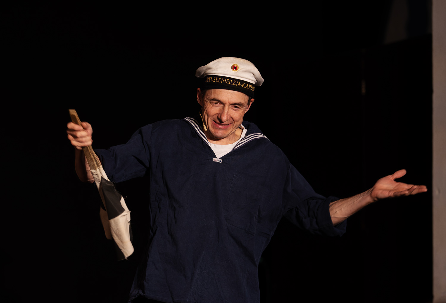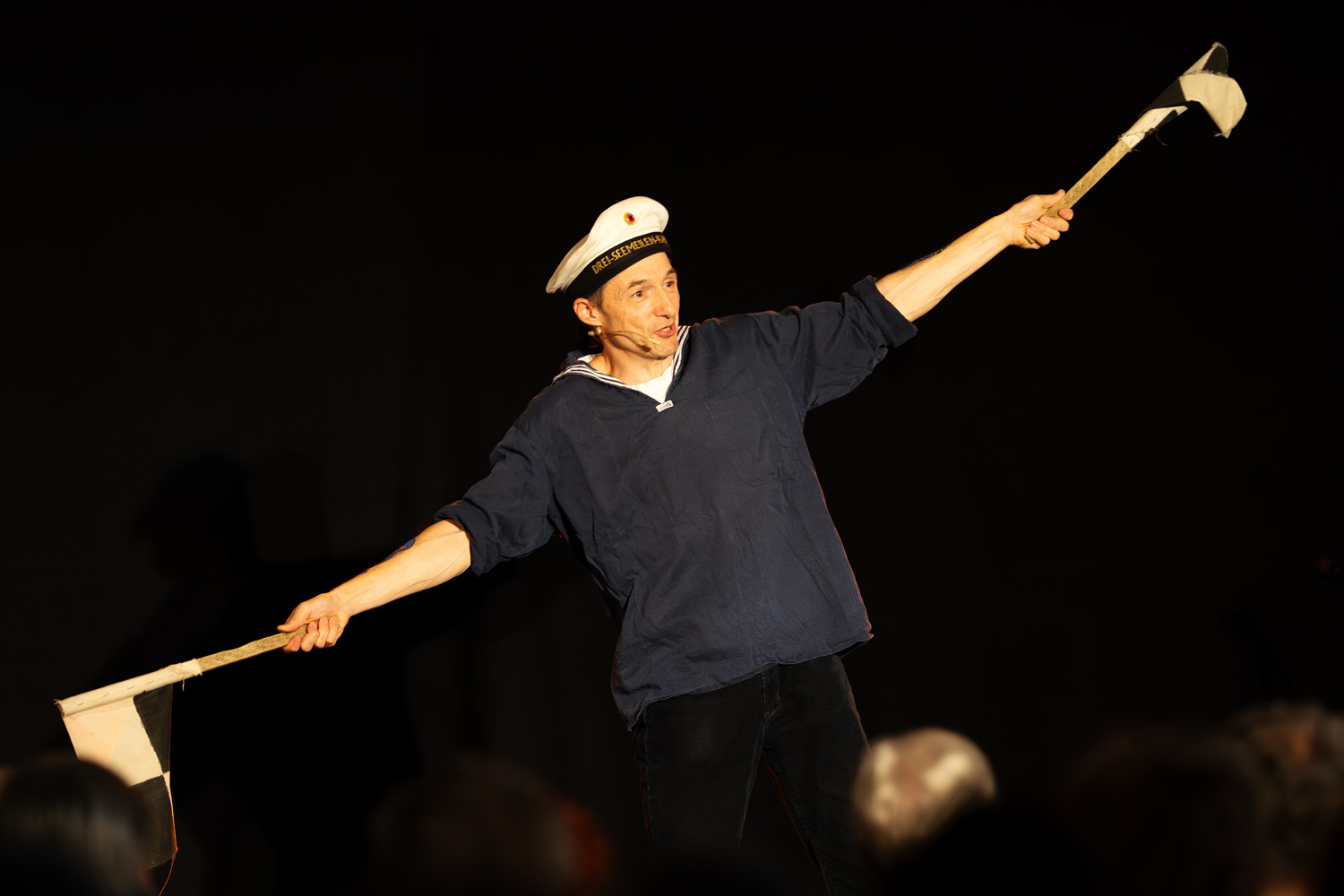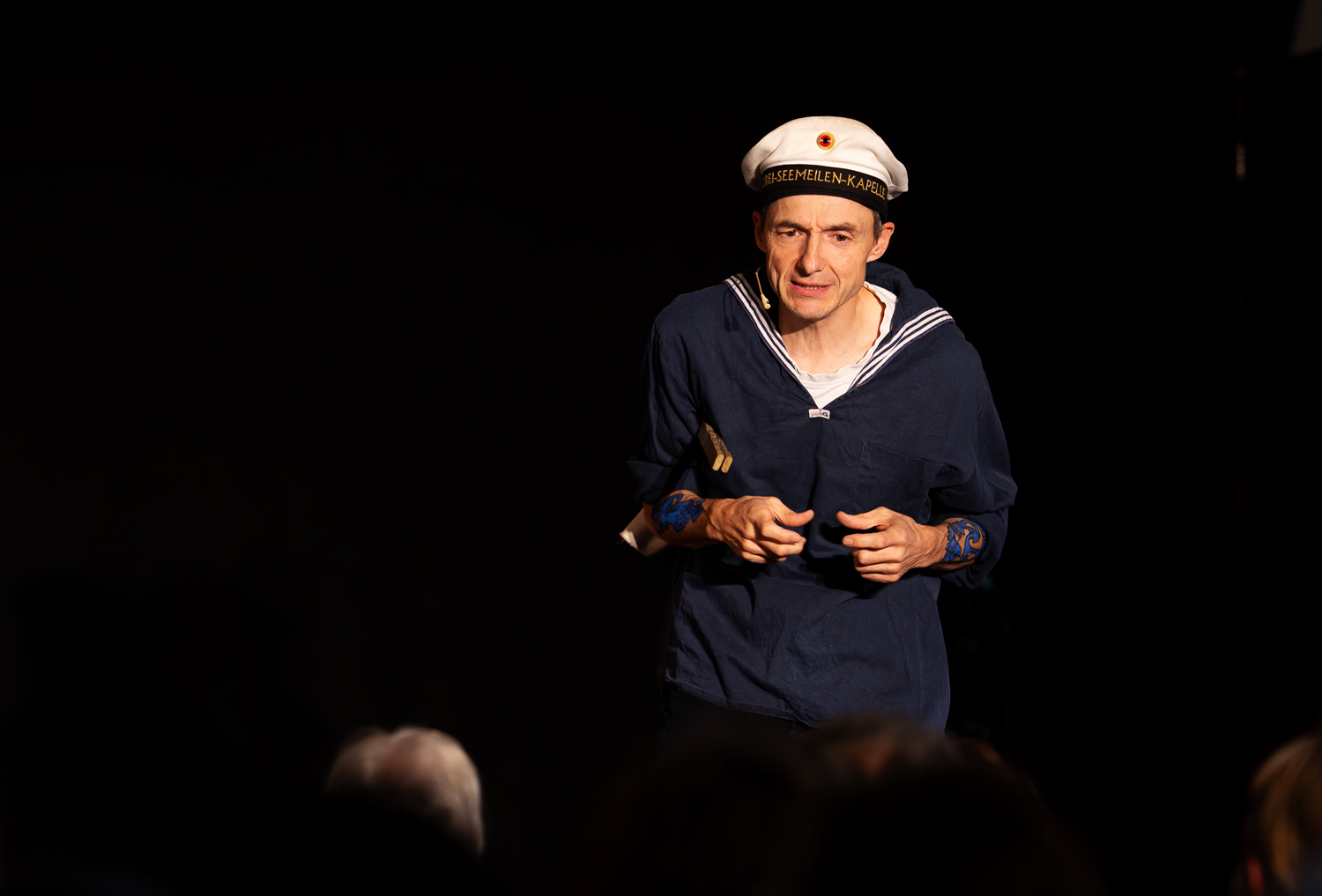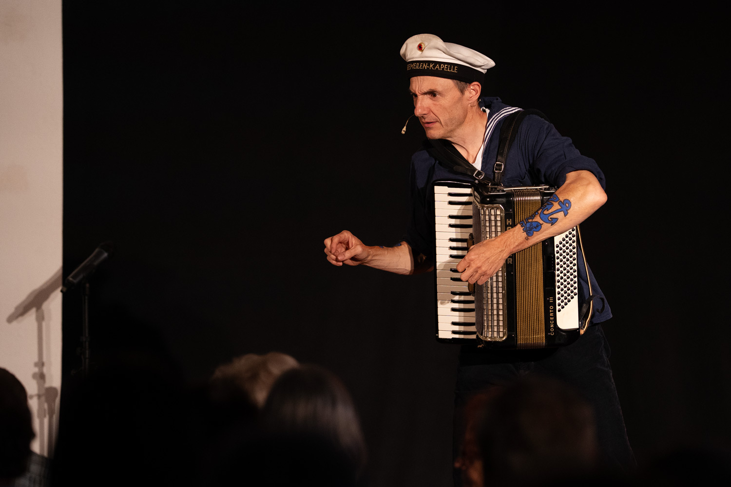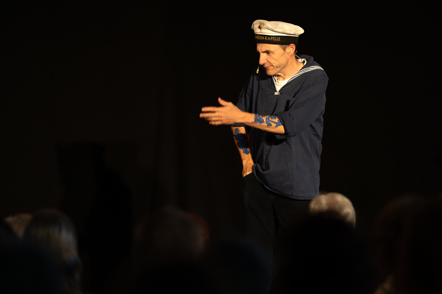 Als letzter trat Nagelritz in das Rennen um die Bachstelze ein. (Wer denkt da nicht an Ringelnatz?) Der Bremer Matrose aus Gelsenkirchen erweist sich als weiterer würdiger Anwärter auf die Bachstelze. „Ein Gelsenkirchner kommt überall zurecht – und findet es überall schön.“ Mit Wortwitz und ausdrucksstarker Mimik unterhielt er sein Publikum. Heute sind alle tätowiert. Im Altersheim treffen sie sich dann zum Bilderraten. Weiter in der Show ging es ans Flaggenraten. Schwarz steht für Pest, Rot für Feuer und Gelb für Quarantäne – schon hat man die Deutschlandfahne. Zwischendurch bekommt das Publikum zu allen irgendwie passenden Gelegenheiten kleine Tüten Ahoj-Brause geschenkt.