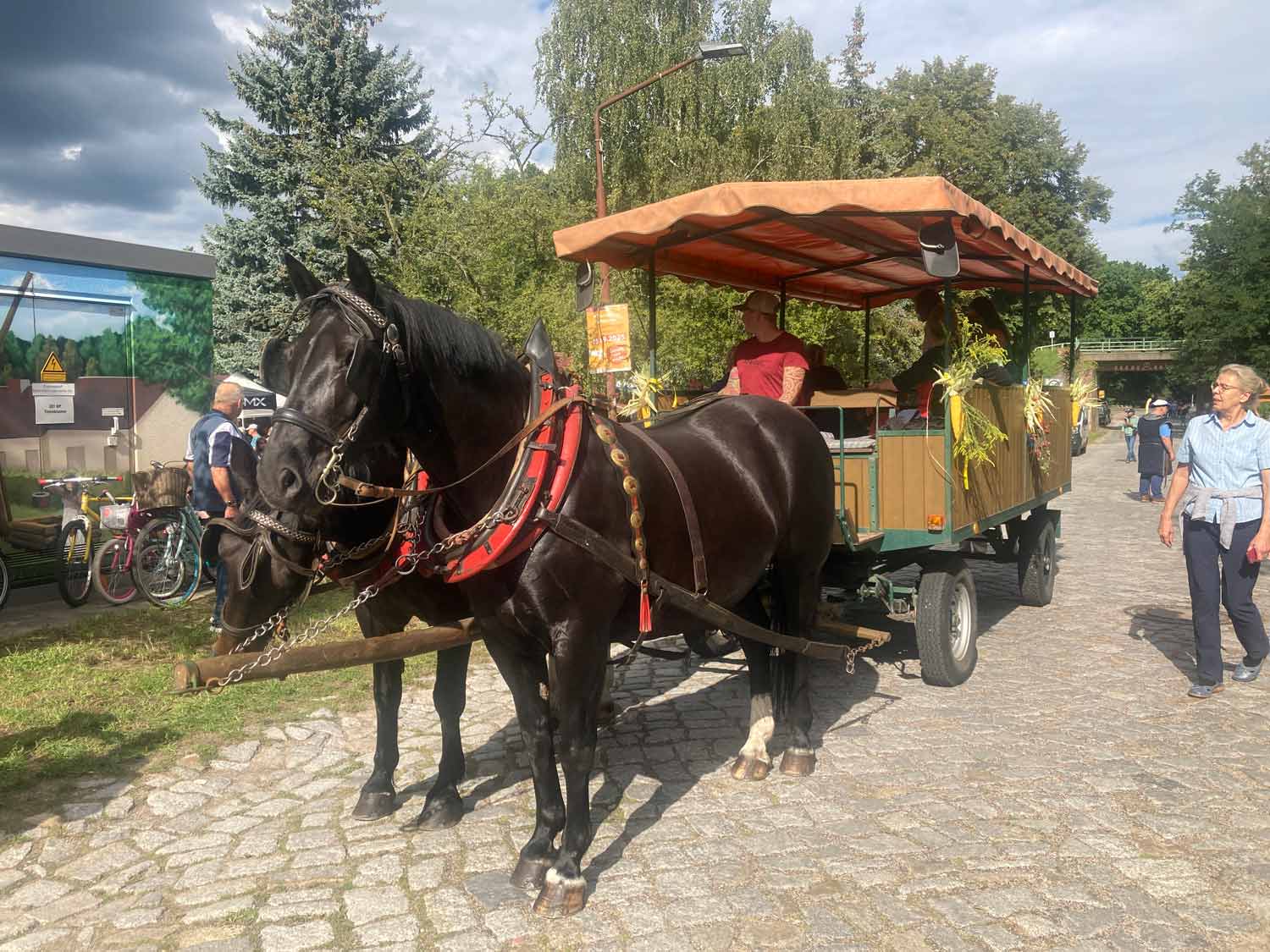 Ein buntes Rahmenprogramm ließ keine Langeweile aufkommen. In einer Fotoausstellung präsentierte der Siedlerverein die Vergangenheit und Gegenwart des Ortes mit seinen momentanen 370 Bewohnern. Bei einer Kremserfahrt durch das Dorf konnten die ältesten Häuser aus dem 18. Jahrhundert bestaunt werden. Die Frohnsdorfer stellten ihre Handwerkskunst und ihre Schätze aus den Garagen aus. Die liebevoll gepflegten zwei- und dreirädrigen Vehikel öffneten ein Fenster mit Sicht auf vergangene Zeiten. Ob „Brände“ löschen mit der Freiwilligen Feuerwehr, Kinderschminken, Basteln oder mit Pfeil und Bogen schießen, das Angebot war vielfältig. Ein Puppentheater versetzte in die Kindheit zurück. Die Tanzgruppe „Klebitzer Hotgirls“ sowie die Linedancer „Happy Boots“ ließen das Festzelt erzittern. Nach dem abendlichen Eröffnungstanz durch Ortsvorsteher Andreas Fetz und seine Frau durften alle das Tanzbein schwingen. Mit kalten Getränken und warmen Köstlichkeiten, guter Stimmung in gemütlicher Atmosphäre kling der Abend aus.