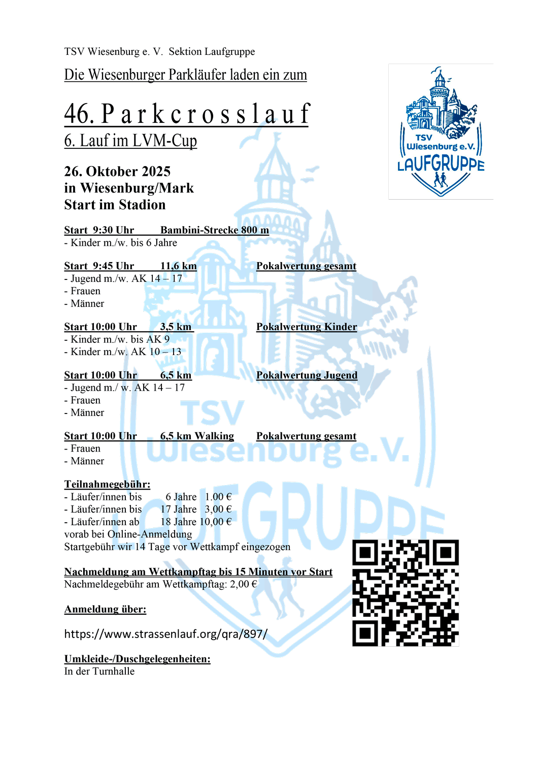 Die Parkläufer laden am 26. Oktober 2025 zum 46. Parkcrosslauf in das Wiesenburger Flämingstadion ein. Die Streckenführung ist analog dem Vorjahr. Der Start und das Ziel befinden sich auf der Aschenbahn. Es stehen 800 m, 4,1 km, 6,5 km und 11,6 km zu Verfügung. Die Ausschreibung für den 46. Parkcrosslauf kann auf der Internetseite des TSV Wiesenburg e.V. ( https://www.tsv-wiesenburg.de/) eingesehen werden. Eine Anmeldung über das Internetportal wird erbeten, dieses ermöglicht einen schnellen und reibungslosen Ablauf bei der Startnummerausgabe. An ein gemütliches Ausklingen mit Wurst und Kuchen ist auch gedacht, wir sehen uns beim Lauf.