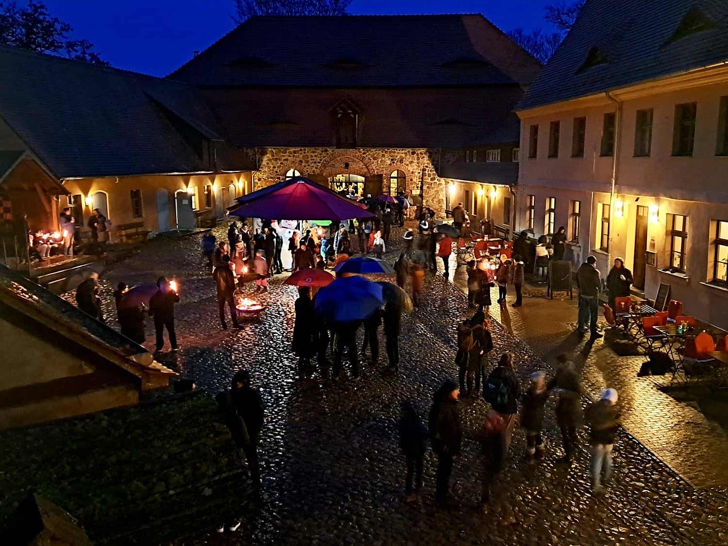 Seit drei Jahren wird diese Tradition auch wieder in Raben durchgeführt und zieht viele Zuhörende an. Wie in den vergangenen Jahren pilgerten viele große und kleine Besucher des Familienweihnachtsmarktes des Naturparkzentrums am ersten Advent mit Fackeln durch den Wald hinauf zur imposanten Burg Rabenstein, um das Turmblasen in den geschichtsträchtigen Gemäuern mitzuerleben.