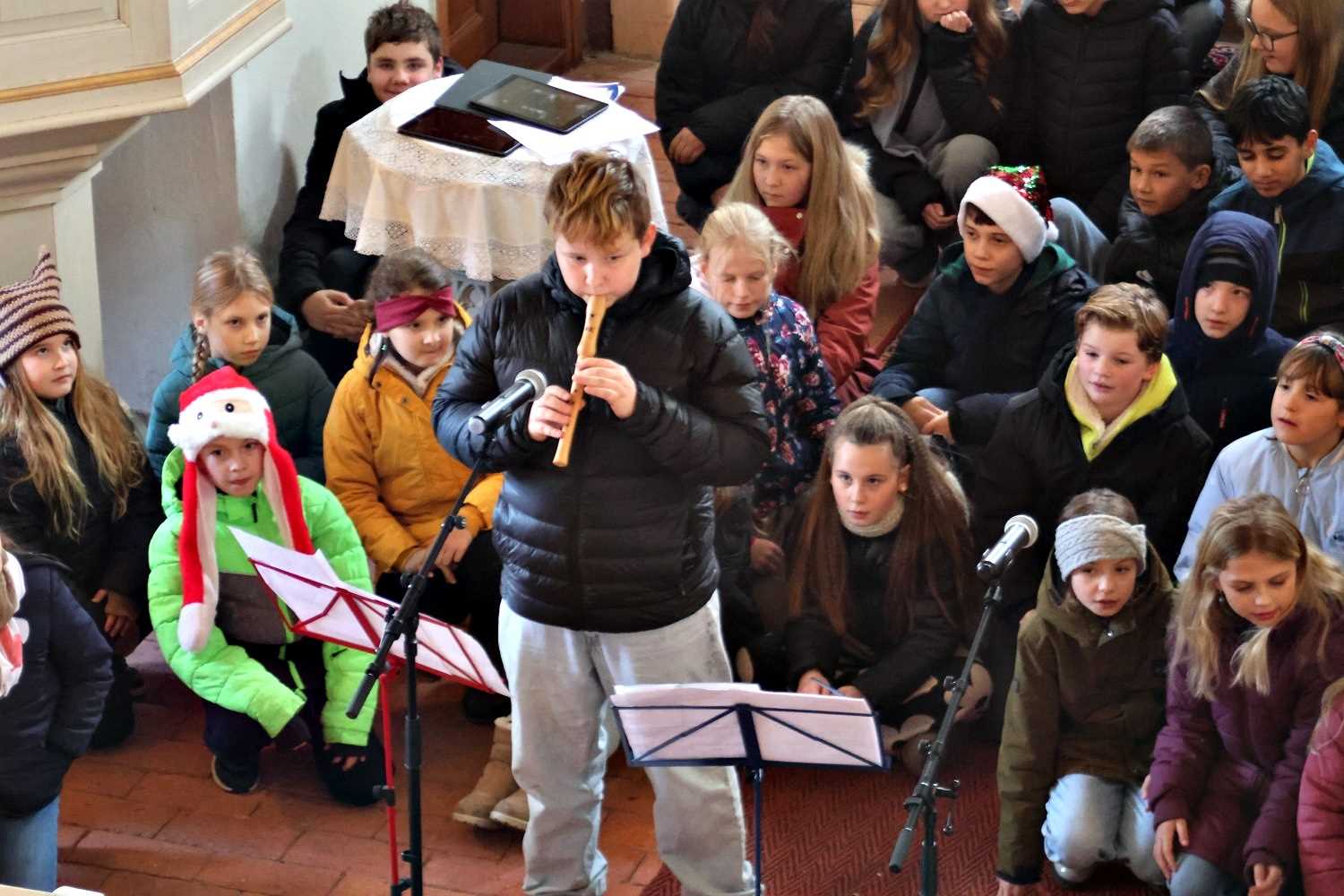 Unter der musikalischen Leitung von Schulleiter Ingo Wagner, der das Konzert am Piano begleitete, präsentierten 43 Kinder der Klassenstufen 2 bis 6 ein abwechslungsreiches und liebevoll vorbereitetes Programm. In der Schule hatten die Kinder mit Ingo Wagner über mehrere Wochen intensiv für diesen besonderen Auftritt geprobt. Besonders viel Applaus erhielten die drei Soloauftritte auf der Flöte sowie drei Gesangssoli, deren „engelsgleiche Stimmen“ das Publikum hörbar berührten.