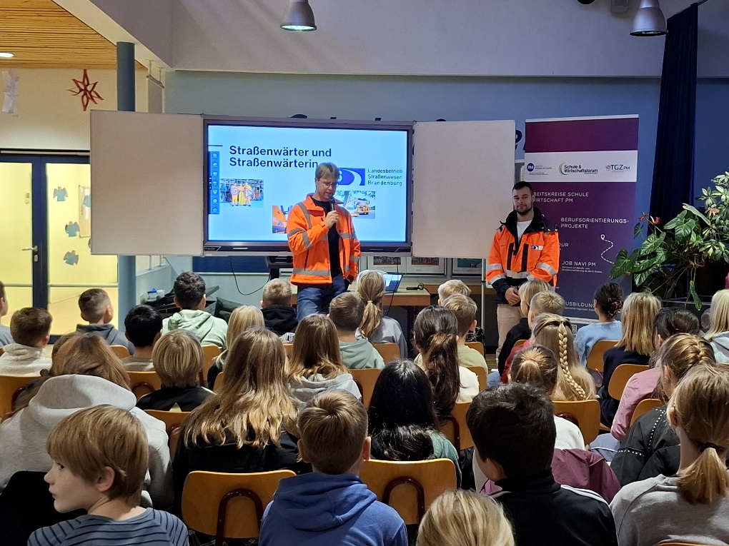 Besonders aufmerksam folgten die Kinder der Tierärztin Nora Wickidal aus Bad Belzig, die von tierischen Patienten und aufregenden Einsätzen erzählte. Auch Candy Schulze und Enrique Rauschenberg vom Landesbetrieb Straßenwesen fanden mit ihrer Präsentation großen Anklang: Beide erklärten, warum Straßenwärterinnen und Straßenwärter bei jedem Wetter im Einsatz sind und wie vielfältig deren Aufgabenbereich ist.