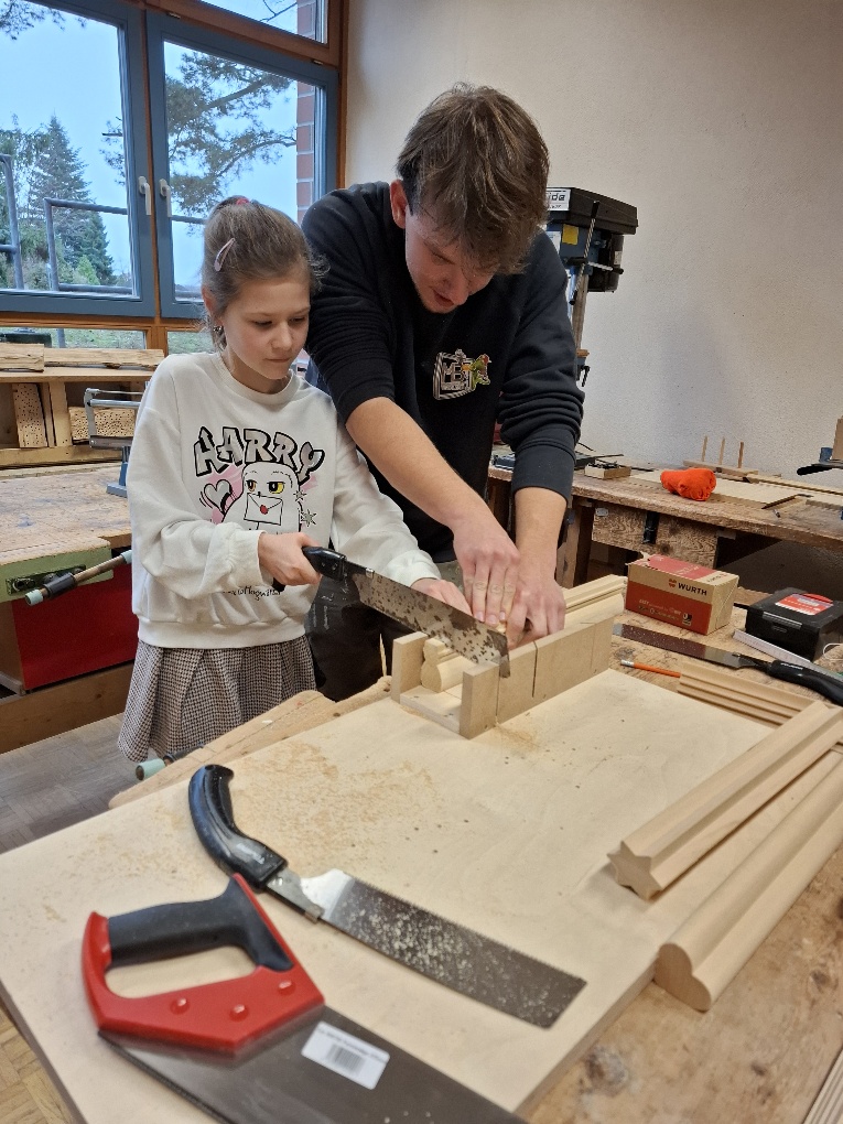 Nach einer kurzen Pause ging es um 10 Uhr in die zweite Runde. Unter dem Motto ‘Berufsorientierung zum Anfassen’ konnten die Schülerinnen und Schüler an zahlreichen Stationen selbst tätig werden. Ob in der Werkstatt mit der MB Fensterbau & Tischlerei e.K., in der Lehrküche mit dem Paulinenhof, beim Theater-Schauspiel oder beim Experimentieren mit Wind- und Bioenergie – überall wurde ausprobiert, gefragt und gestaunt.