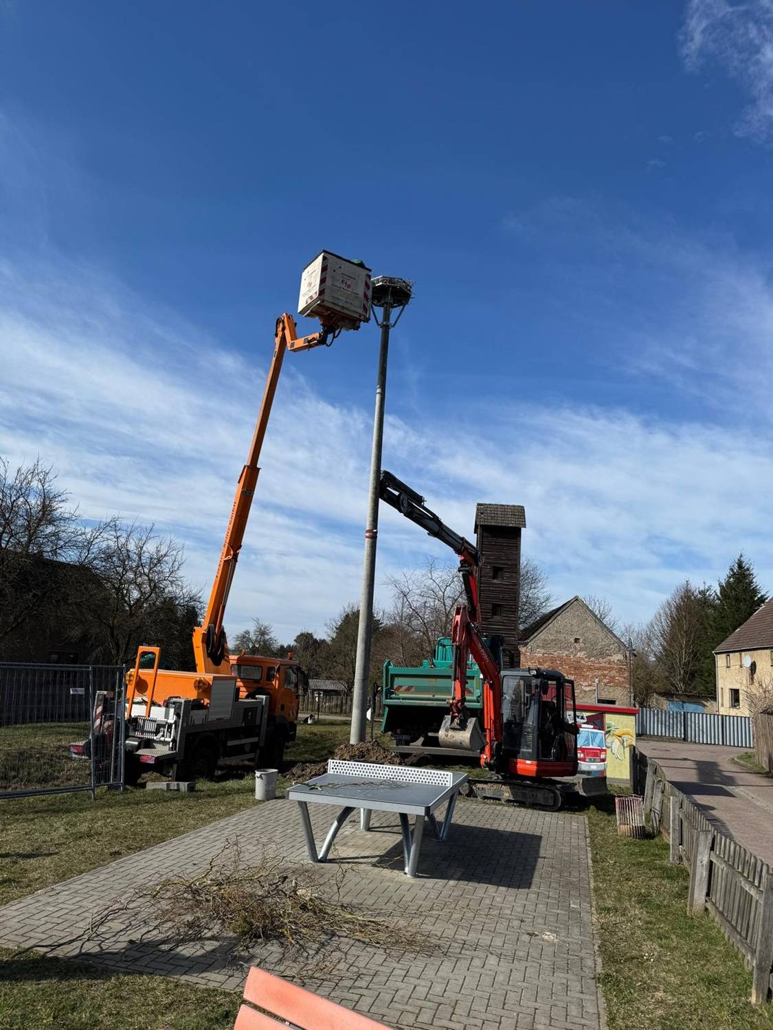Aber nun wurde in der vergangenen Woche das Nest in der Nähe der Feuerwehr aufgestellt. Das Nest selbst wurde vom NABU gesponsert, der Betonmast von der E.dis. Aufgestellt wurde alles von Jürgen Skoruppa,Heino Gäms und Norman Schulze mit Arbeitern und Maschinen der Firma Elektro Belitz. Nun hoffen alle, dass die neue Wohnung auch einem Storchenpaar gefällt.