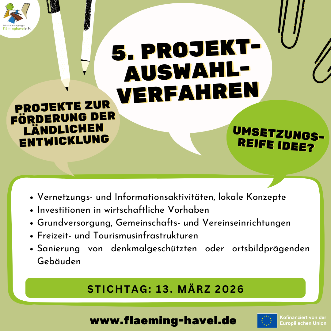 Potsdam-Mittelmark. Zur Umsetzung unserer Regionalen Entwicklungsstrategie (RES) 2023 – 2027 in der LEADER-Region Fläming-Havel rufen wir zur Teilnahme am fünften Projektauswahlverfahren auf. Insgesamt stehen uns